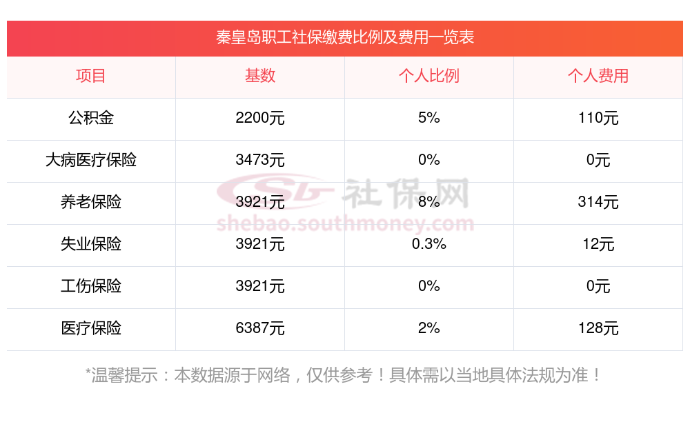 社保缴纳比例一览,社保公司和个人各交多少?下表是2023-2024年秦皇岛社保费用明细参考,新社通app-社保缴费查询工具提供的最新数据如下:
