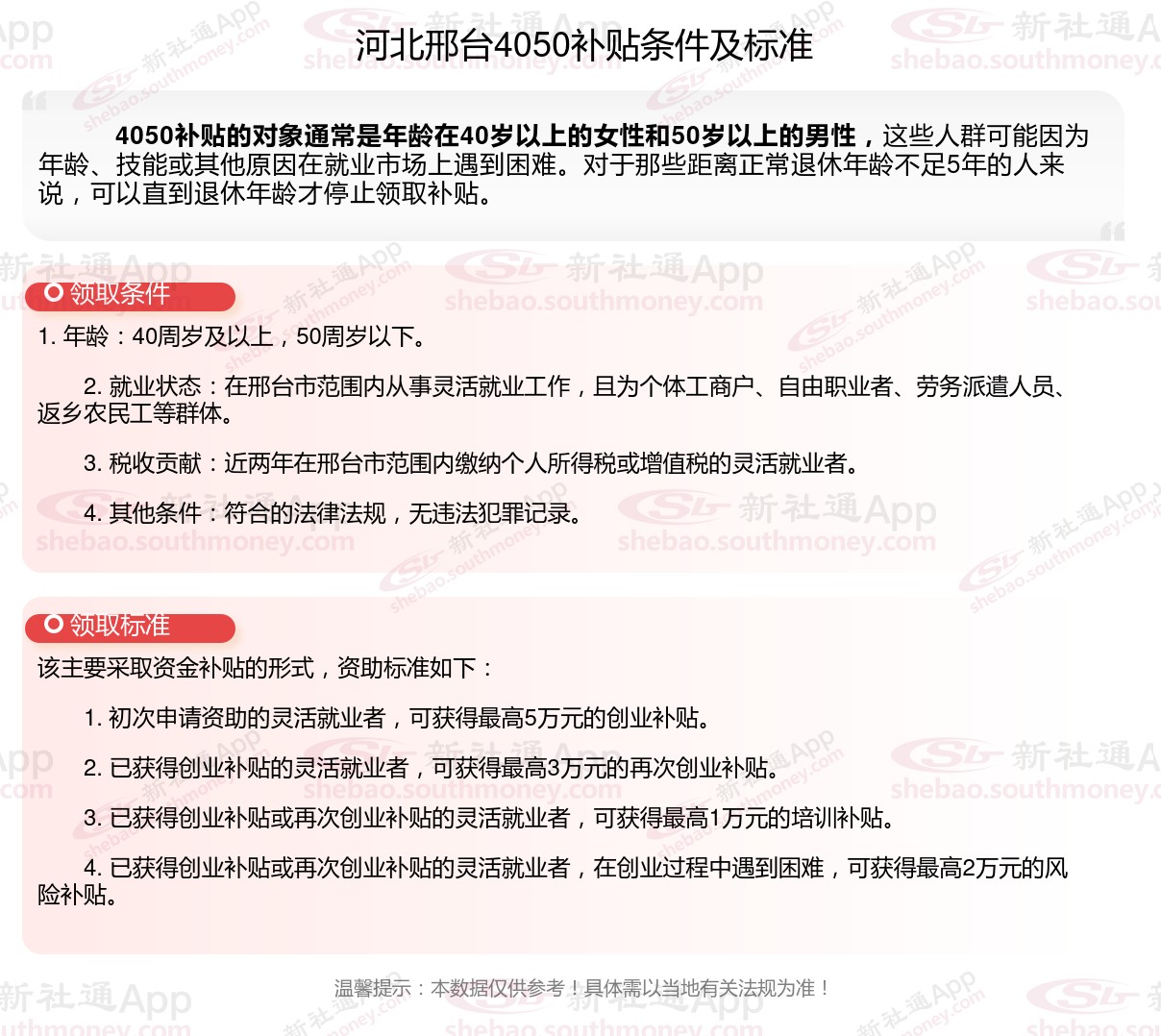 2025河北邢台4050补贴主要针对的是年龄在40岁以上的女性和50岁以上的男性,这些人群通常因为年龄较大而面临就业困难。