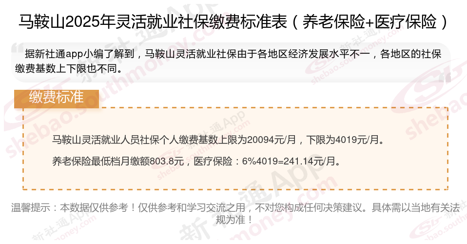 据新社通app数据显示,马鞍山灵活就业养老保险缴费基数2024-2025年最新标准如下: