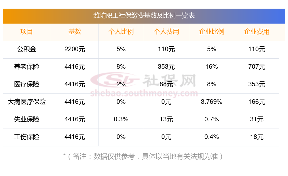 潍坊缴费社保比例一览 社保公司和个人各交多少?下表是2024-2025年潍坊社保费用明细参考,新社通app-社保缴费查询工具提供的最新数据如下: