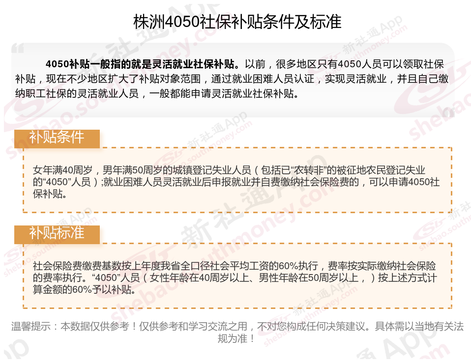 株洲4050灵活就业社保补贴是什么?今天聊一下4050补贴话题。4050补贴听起来像是一个针对特定年龄人群的社保补贴。比如女性需年满40周岁,男性需年满50周岁(以申请当年12月31日为截止日期)。那么株洲4050灵活就业社保补贴标准是多少钱?株洲4050社保补贴可以领取多少?接下来随新社通APP小编了解一下株洲4050灵活就业社保补贴的最新资讯。