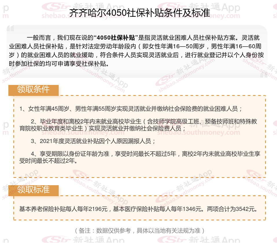 4050社保补贴标准据新社通app小编了解,通常,4050社保补贴包含基本医疗保险和基本养老保险两个险种,社保补贴金额为申请人实际缴纳基本养老保险和基本医疗保险金额的2/3,具体标准以当地社保局公布的数据为准!那么齐齐哈尔4050灵活就业困难人员社保补贴标准是多少?齐齐哈尔4050社保补贴需要符合什么条件?接下来随新社通APP小编具体了解一下4050社保补贴内容。