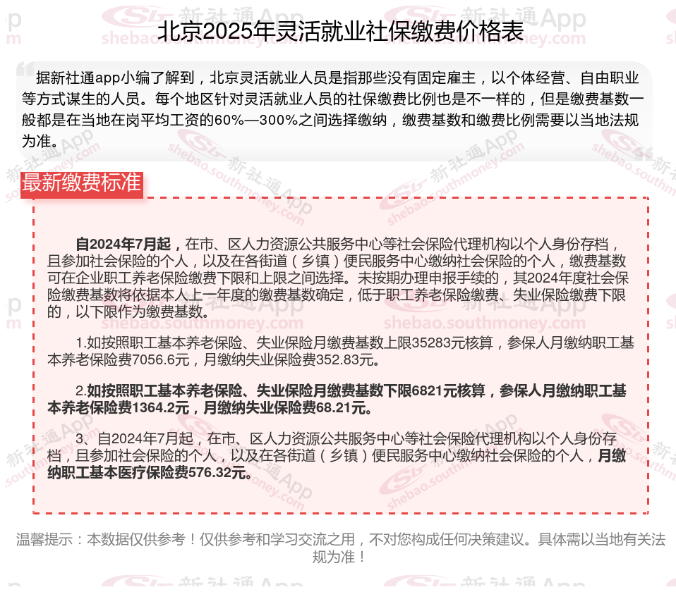 灵活就业者交社保一个月多少钱?2025社保缴费标准,根据新社通app-社保缴费查询工具提供的2025社保缴费标准详情数据如下: