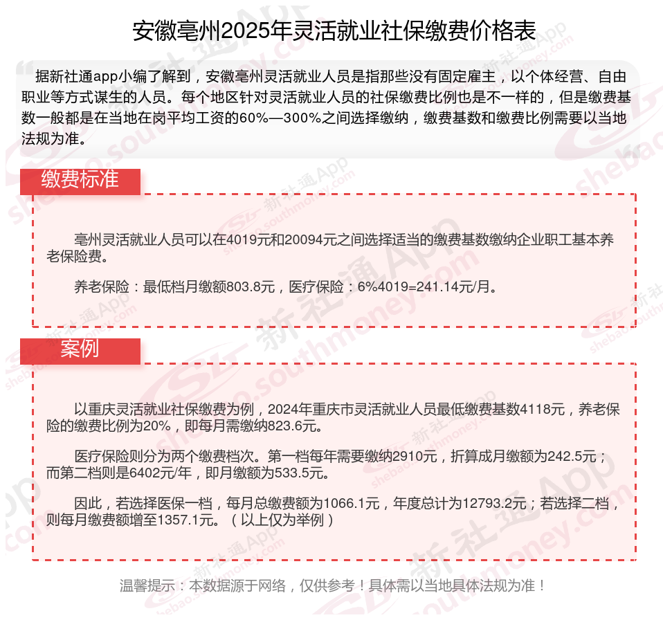 据新社通app数据显示,2024-2025年安徽亳州灵活就业人员养老保险的缴费标准是根据缴费基数来确定的: