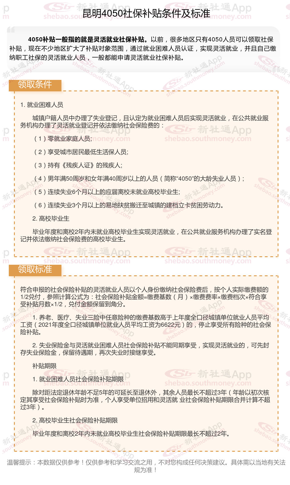 二、昆明4050社保补贴标准及条件4050社保补贴,最新如下