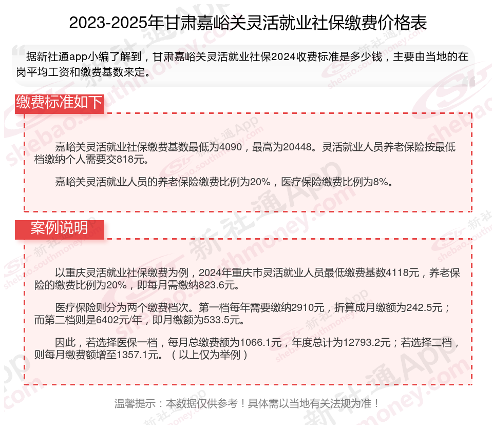 据新社通app数据显示,甘肃嘉峪关灵活就业人员养老缴费基数2024-2025年最新标准如下: