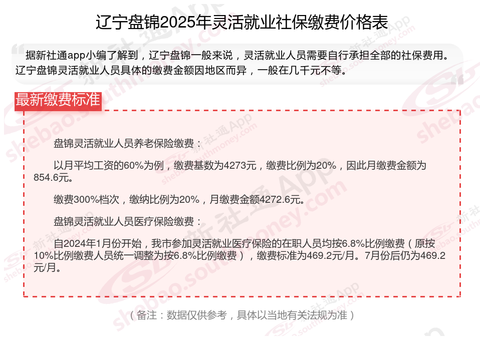 据新社通app数据显示,辽宁盘锦灵活就业养老保险的缴费基数为:4273元。灵活就业人员参保缴费的比例为个人20%。