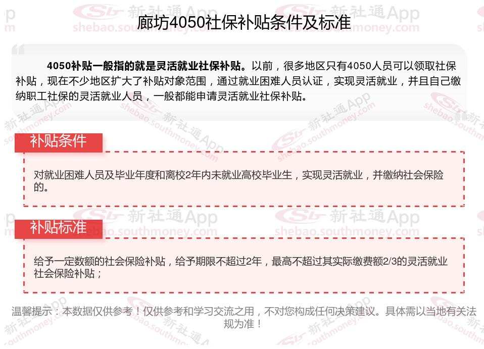 二、2025年廊坊4050社保补贴标准及条件,最新如下:
