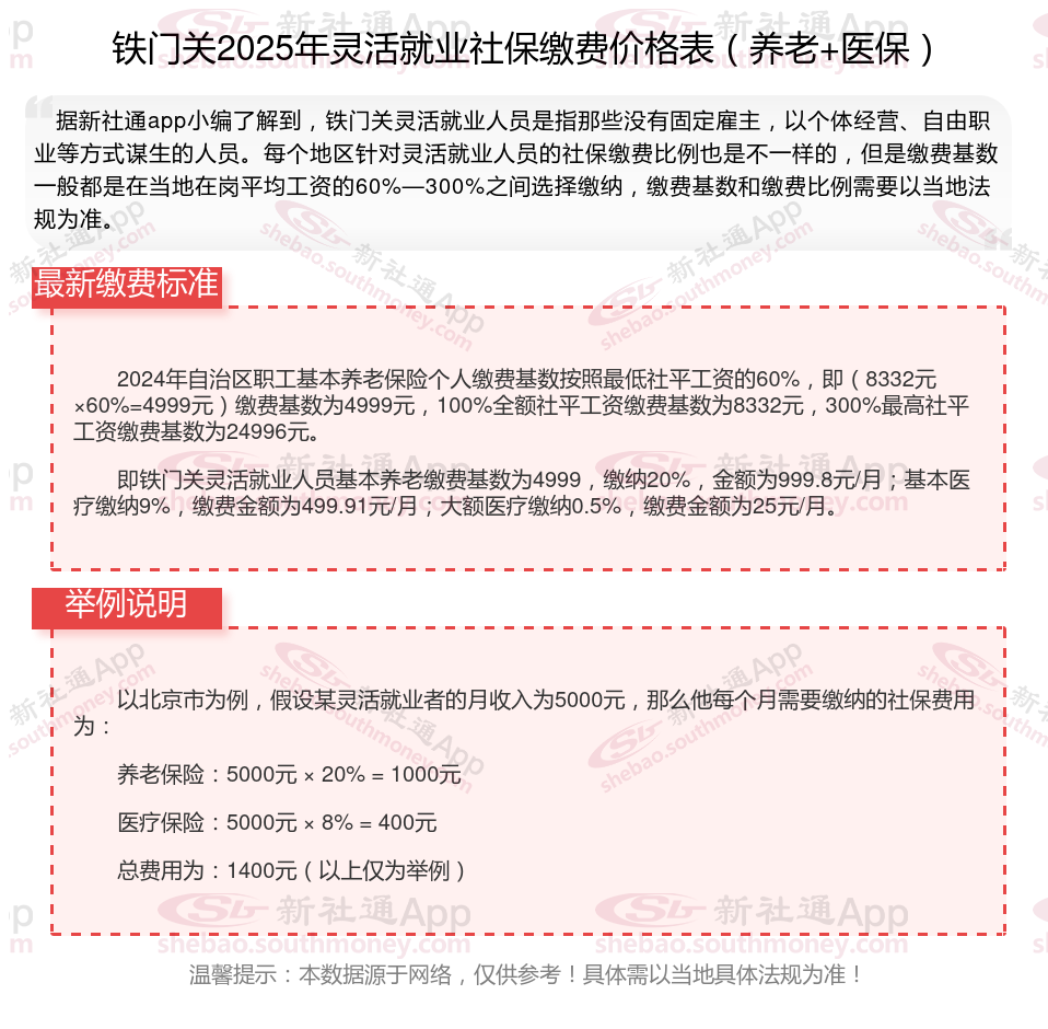 据新社通app数据显示,铁门关灵活就业养老保险缴费基数2024-2025年最新标准如下: