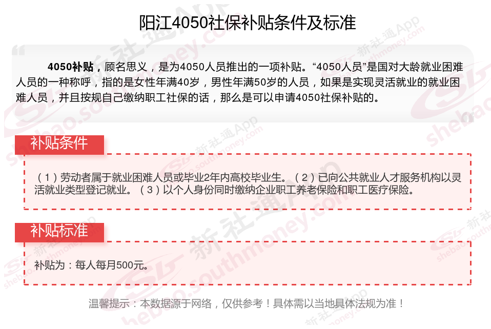 二、2025年阳江4050社保补贴标准是多少?领取条件是什么?