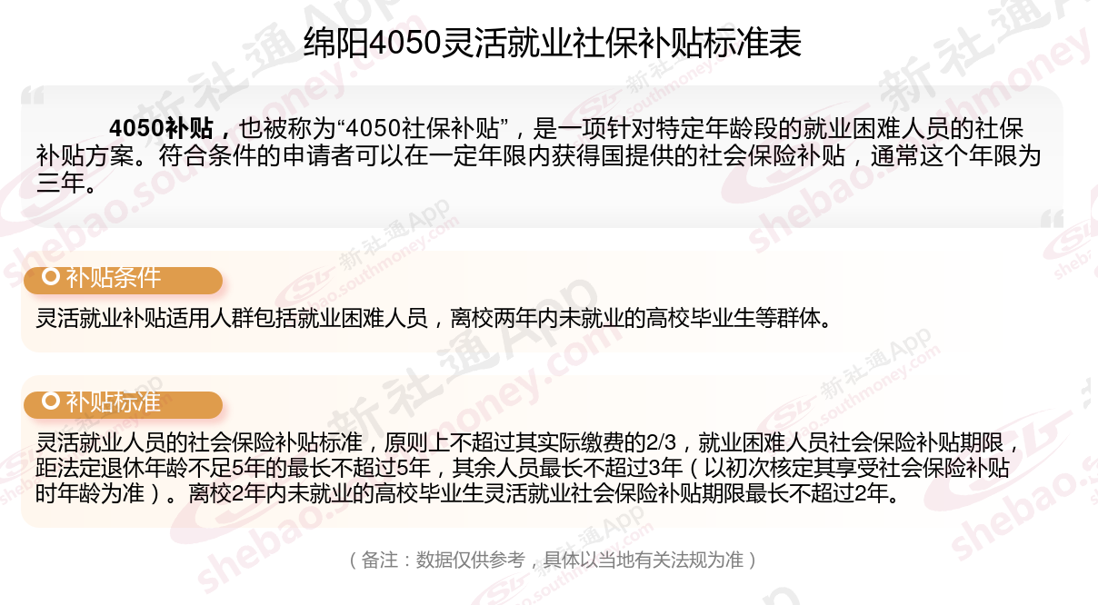 以上就是绵阳4050灵活就业社保补贴的相关内容,欢迎关注新社通/下载新社通APP了解更多五险一金专业资讯。