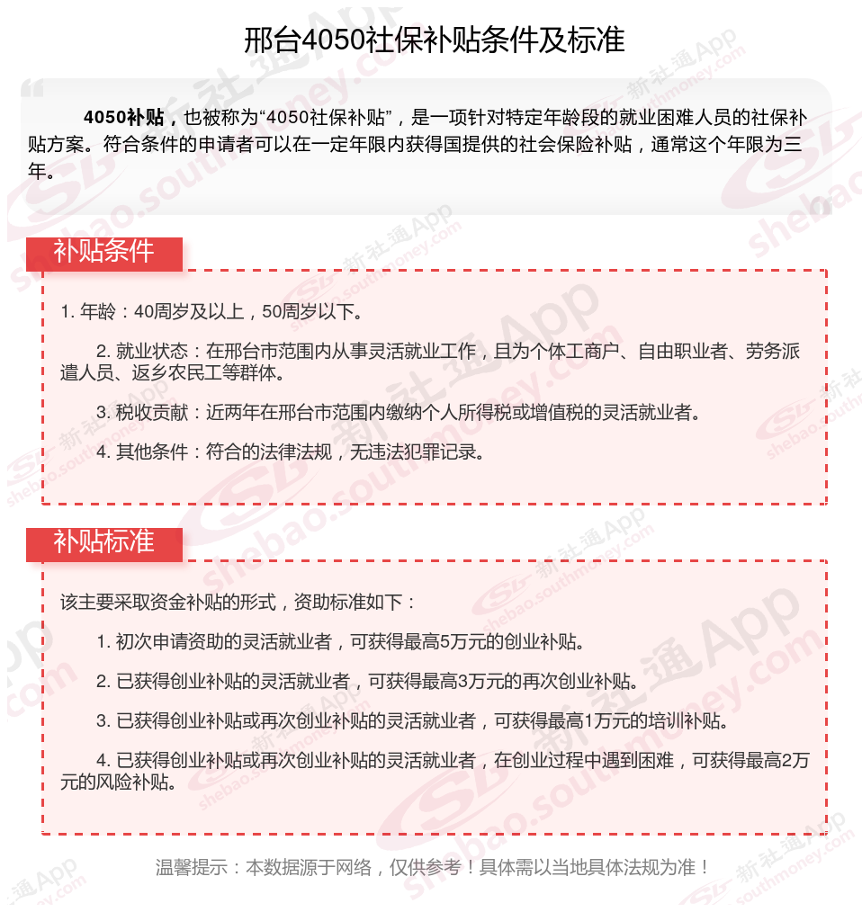 二、邢台4050社保补贴标准及条件4050社保补贴,最新如下