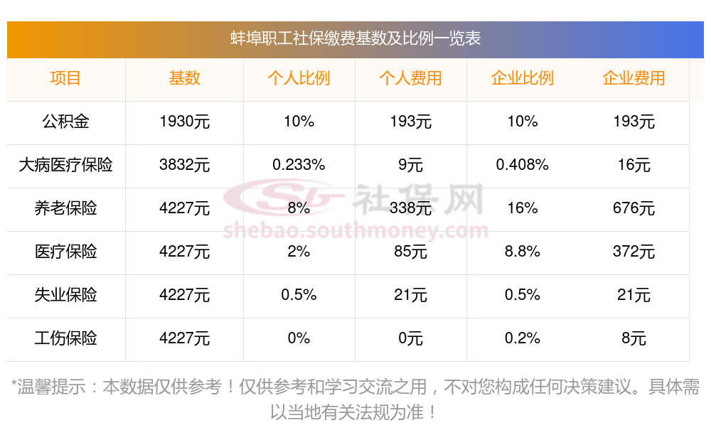 2025年蚌埠社保缴费多少钱?下表是2024-2025年蚌埠社保费用明细参考,新社通app-社保缴费查询工具提供的最新数据如下: