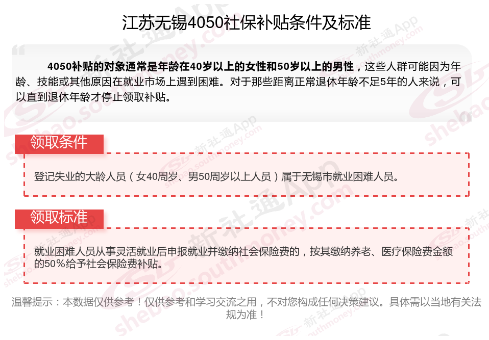 二、2025年江苏无锡4050社保补贴标准及条件,最新如下: