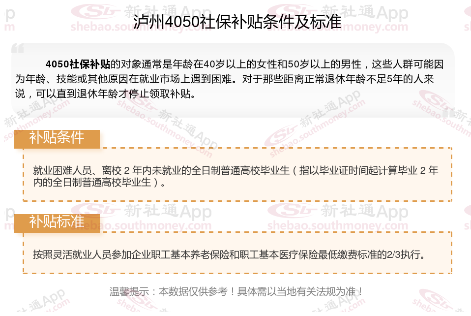 一、泸州4050社保补贴标准及条件2025年最新消息