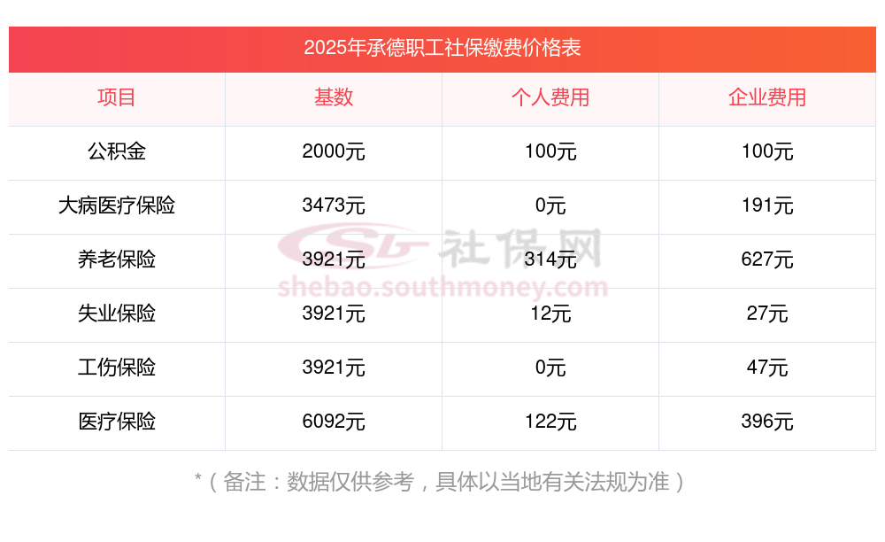 2025年承德社保缴费多少钱?社保要缴够多少年可以退休?下表是2024-2025年承德社保费用明细参考,新社通app-社保缴费查询工具提供的最新数据如下: