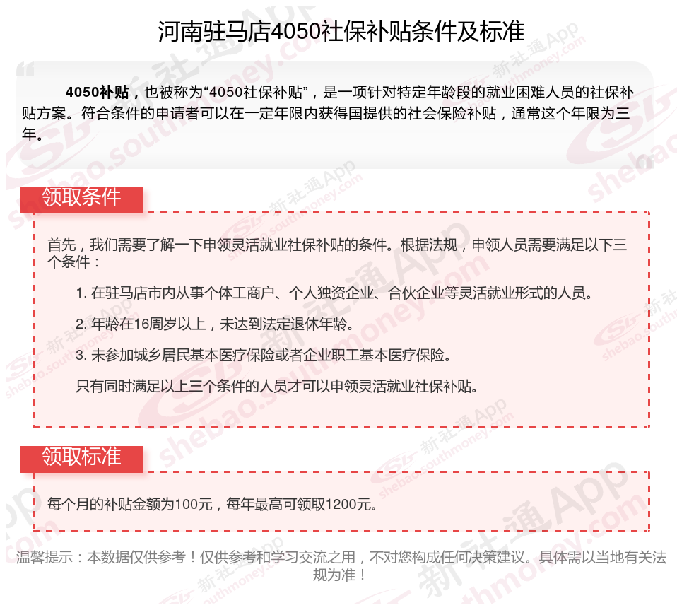 二、2025年河南驻马店4050社保补贴标准是多少?领取条件是什么?