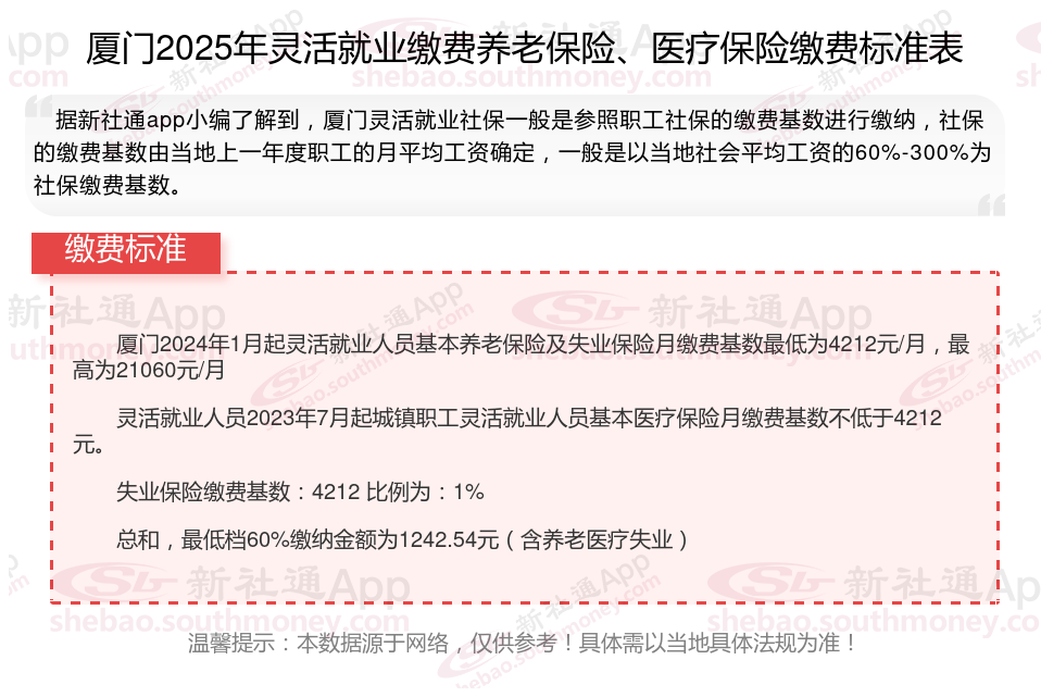 以上就是带来厦门灵活就业社保缴费标准相关知识,内容供参考,希望对你有帮助,欢迎关注/下载新社通APP解锁更多社保专业资讯。