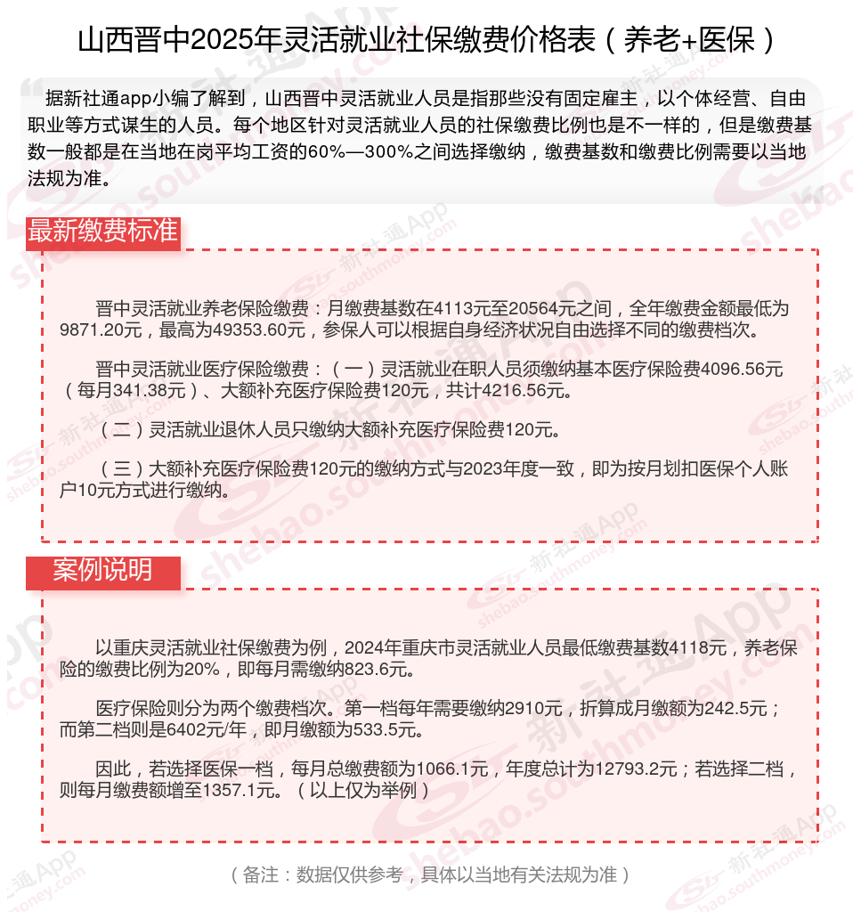 2025年山西晋中灵活就业缴费标准个人交多少呢, 个人是可以自己交社保的吗?根据新社通app-社保缴费查询工具提供的最新数据如下: