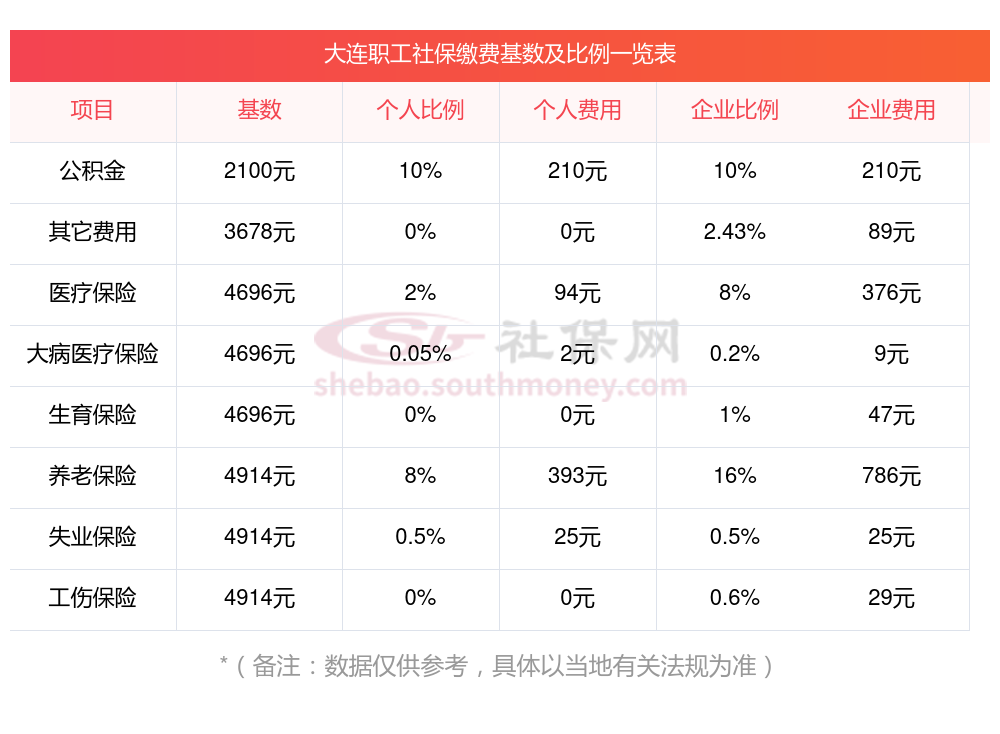 2025年大连五险缴费标准是多少,2025年大连社保缴费多少钱?下表是2025年大连社保费用明细参考,新社通app-社保缴费查询工具提供的最新数据如下: