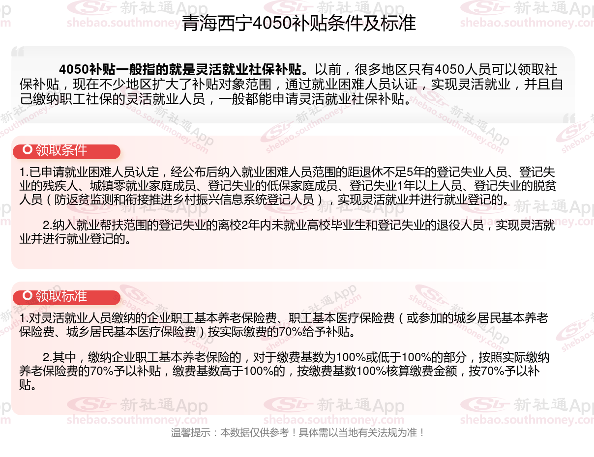 二、2025年青海西宁4050社保补贴标准及条件,最新如下:
