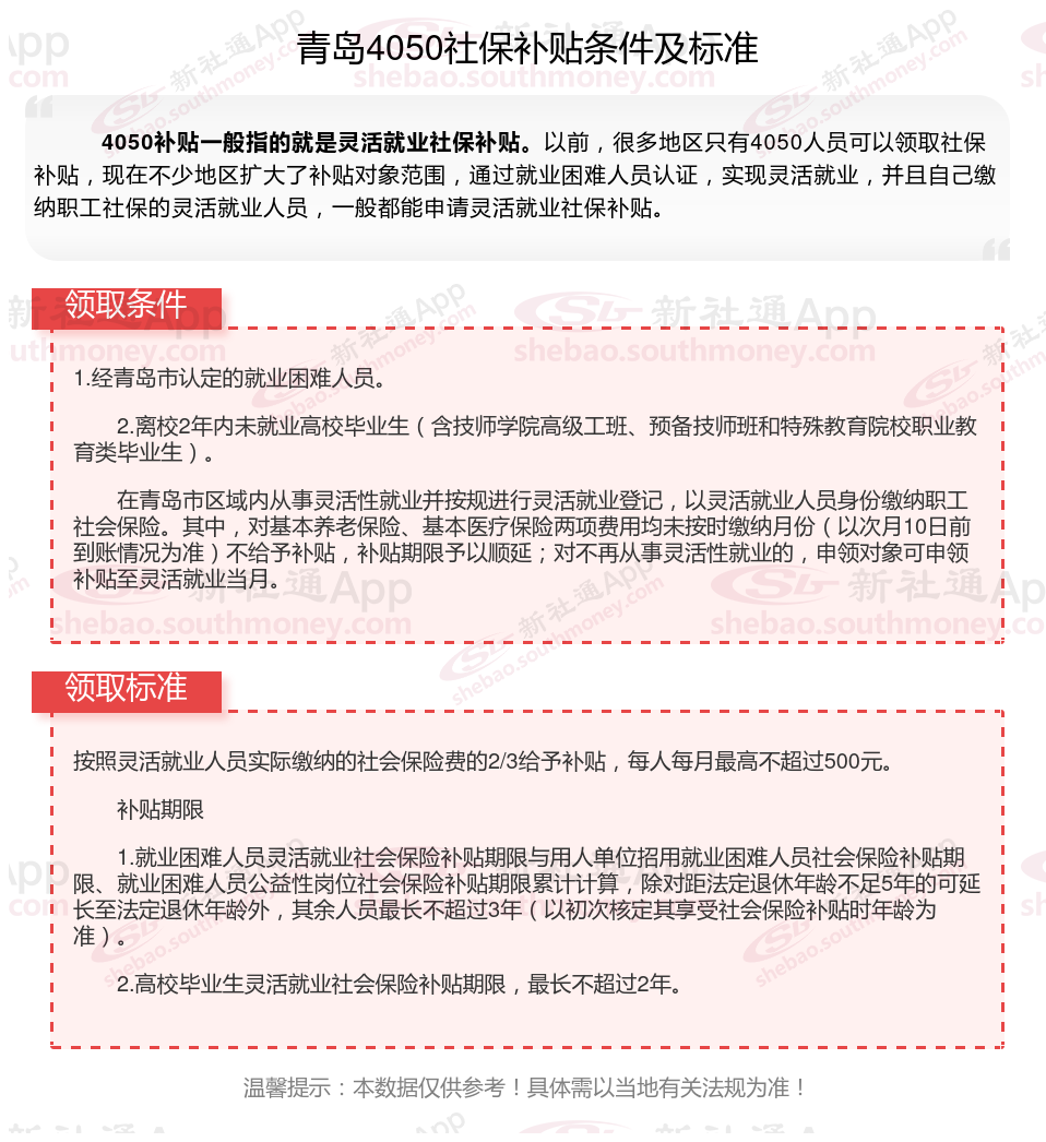 二、青岛灵活就业4050社保补贴标准及条件是什么