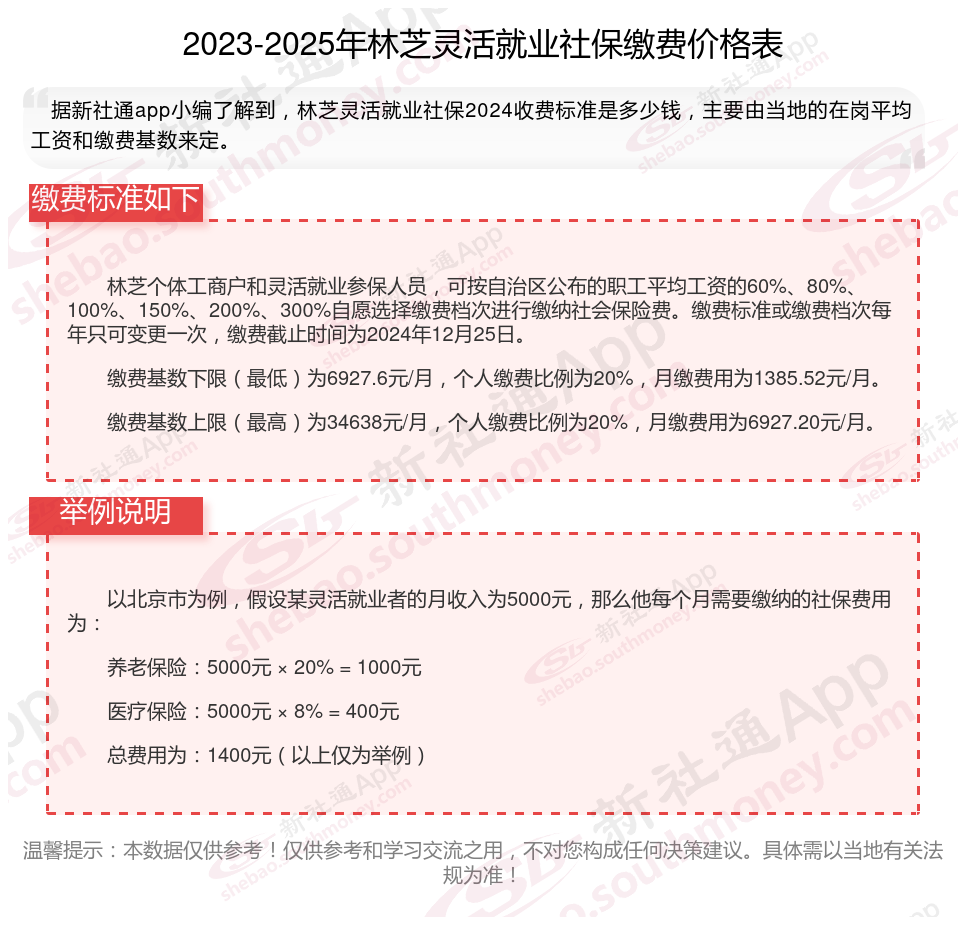 2025灵活就业社保缴费标准的调整,既体现了法规的连续性,又适应了经济社会发展的要求。灵活就业人员应根据自身情况,合理选择缴费基数和缴费比例,确保自身权益得到充分保证。那么2025年林芝灵活就业人员社保需要交多少钱?下面随新社通小编一起来看看。