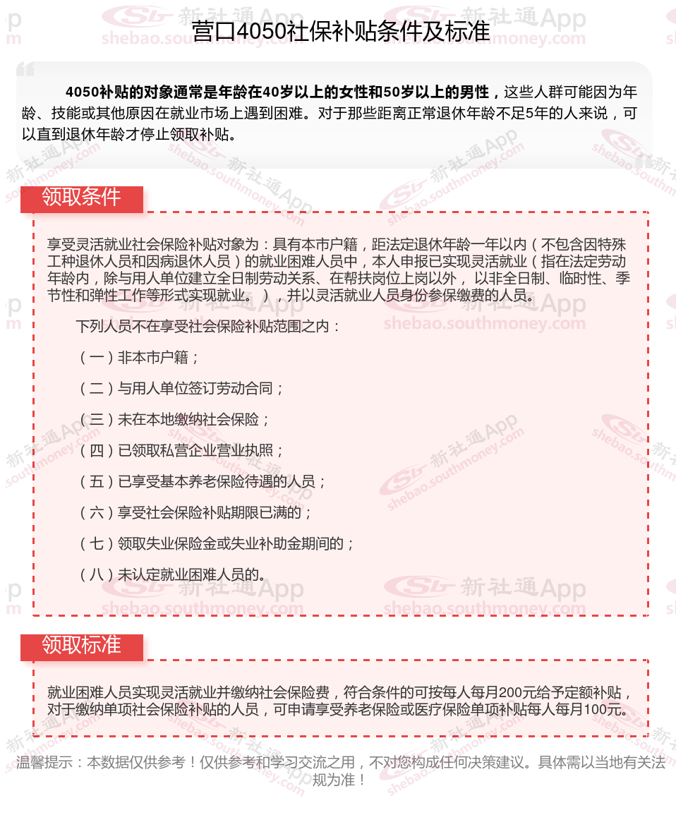 2025营口4050补贴主要针对的是年龄在40岁以上的女性和50岁以上的男性,这些人群通常因为年龄较大而面临就业困难。
