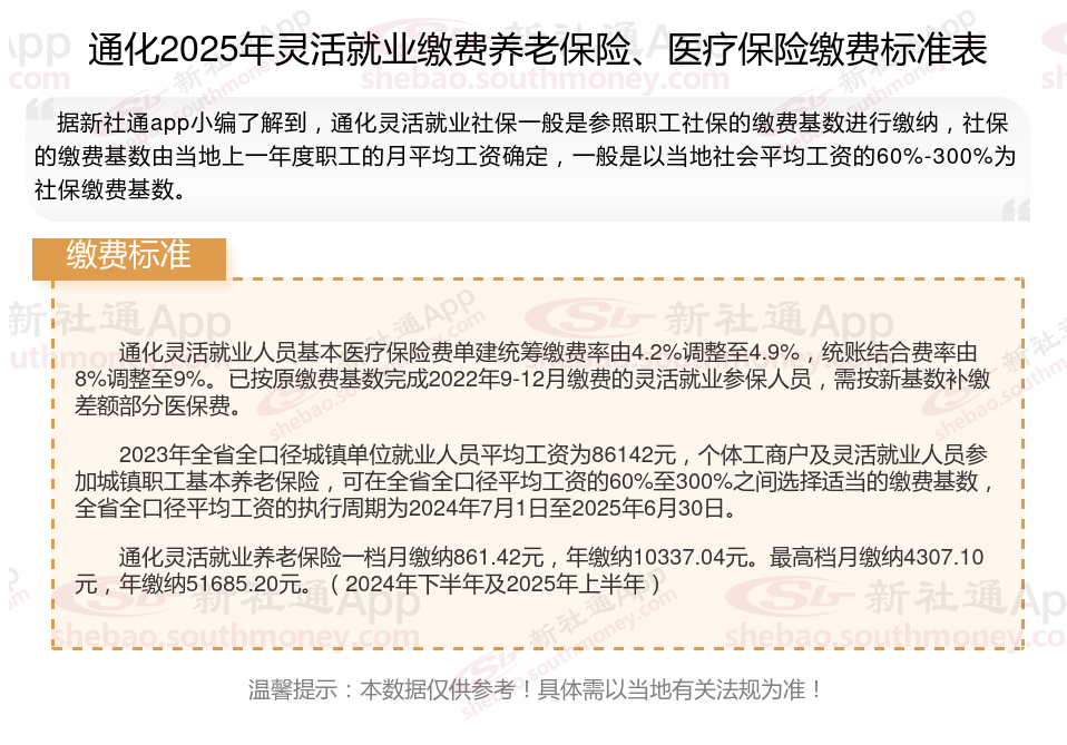 据新社通app数据显示,通化灵活就业养老保险缴费基数2024-2025年最新标准如下: