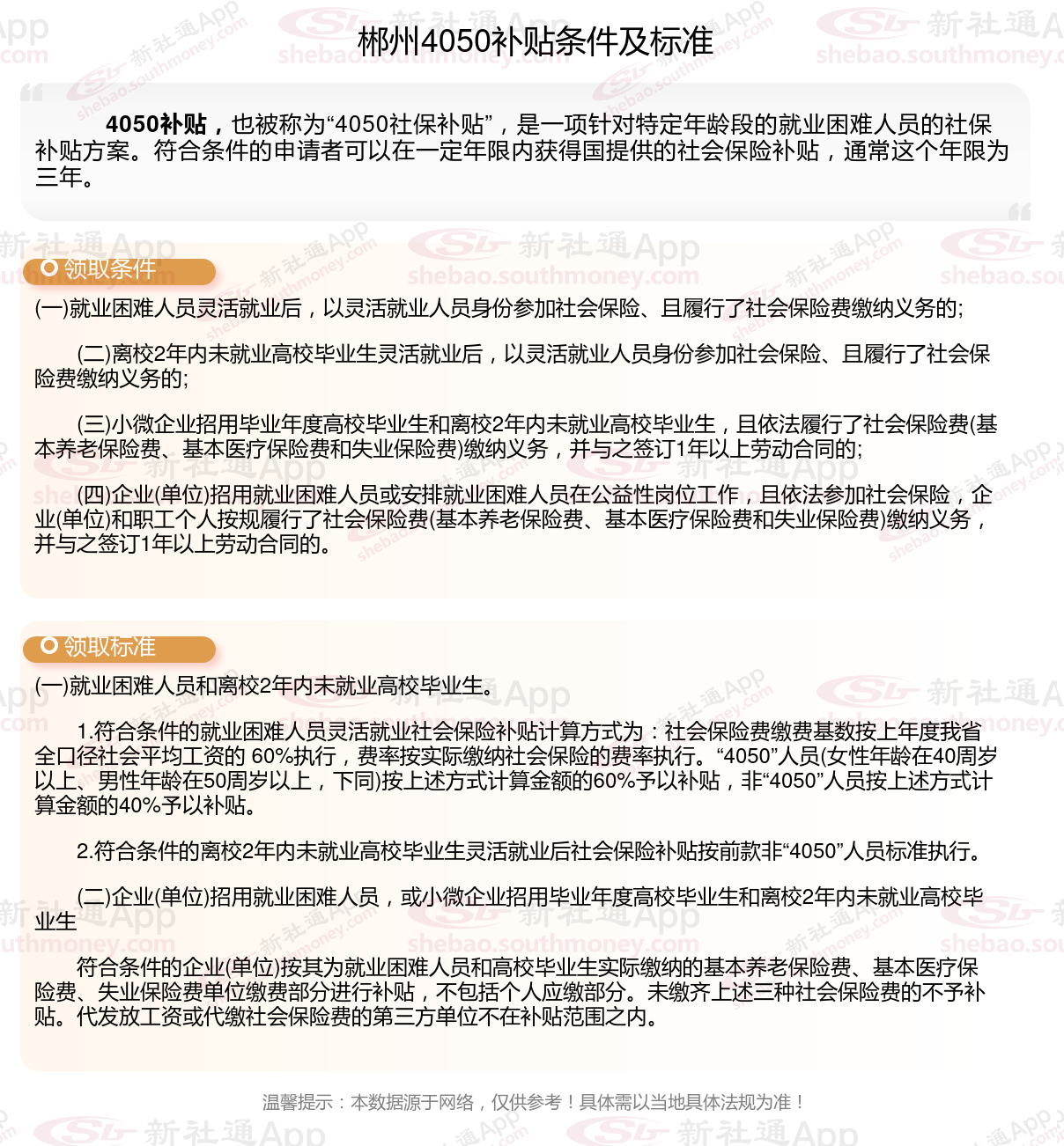 一、2023-2024年郴州4050社保补贴标准及条件是多少?