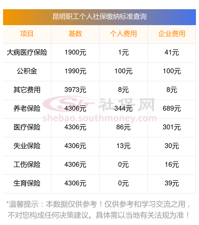 昆明缴费社保比例一览 社保公司和个人各交多少?下表是2024-2025年昆明社保费用明细参考,新社通app-社保缴费查询工具提供的最新数据如下: