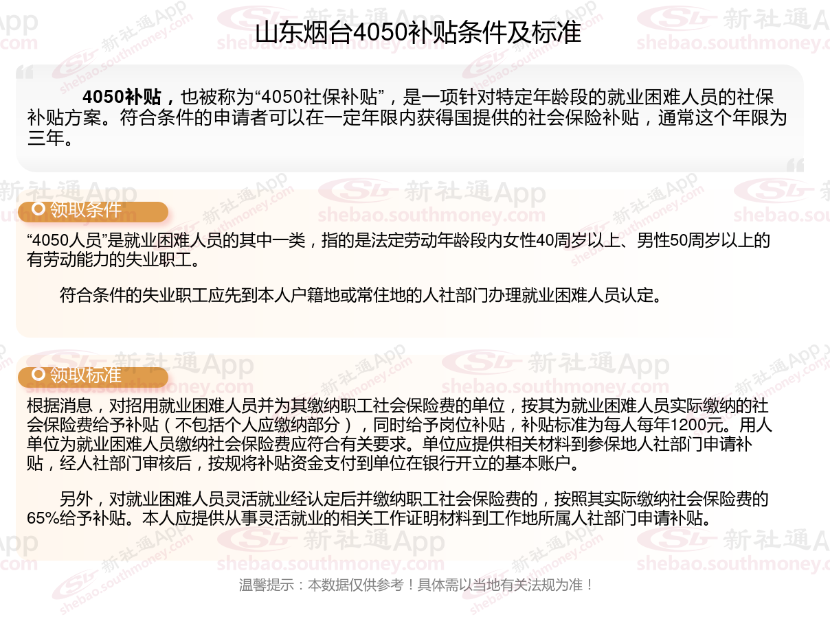 二、山东烟台4050社保补贴多少钱一个月?山东烟台4050社保补贴2025年最新标准是多少?