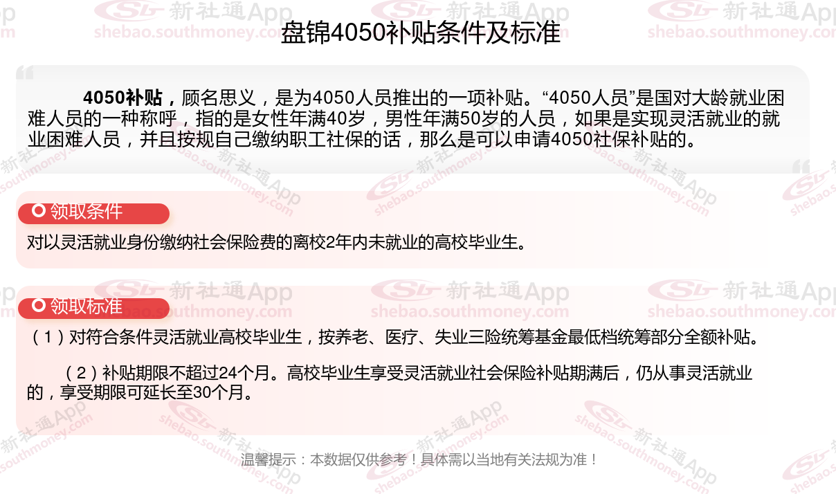 一、2023-2024年盘锦4050社保补贴标准及条件,最新如下