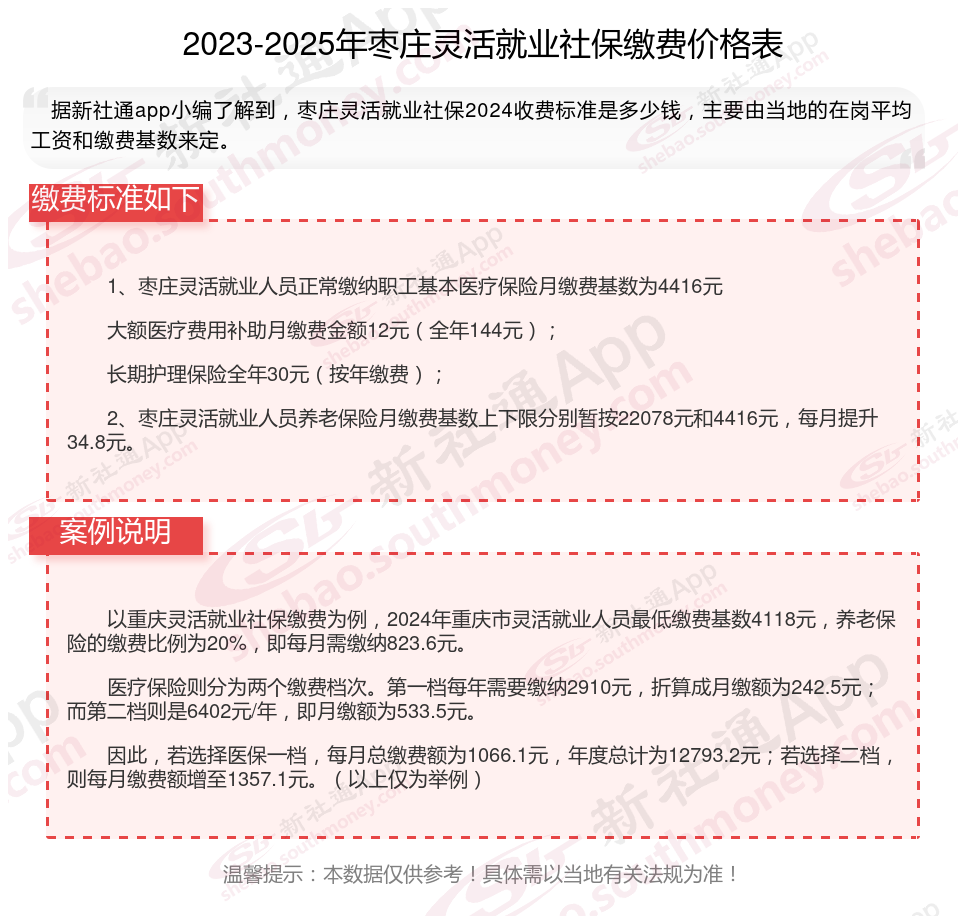 据新社通app数据显示,枣庄灵活就业养老保险缴费基数2024-2025年最新标准如下: