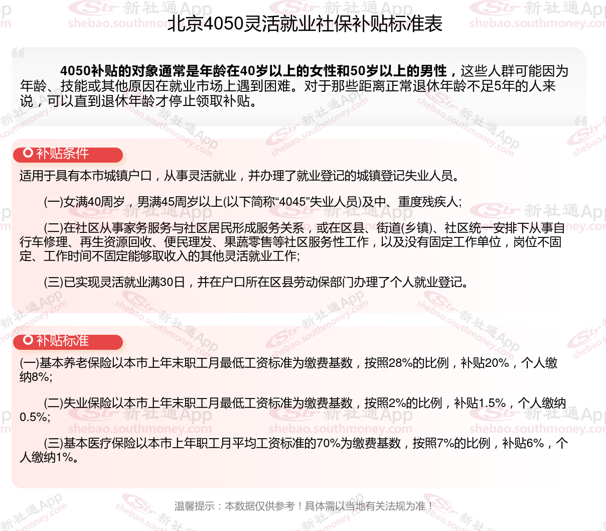 二、北京4050社保补贴标准及条件4050社保补贴,最新如下