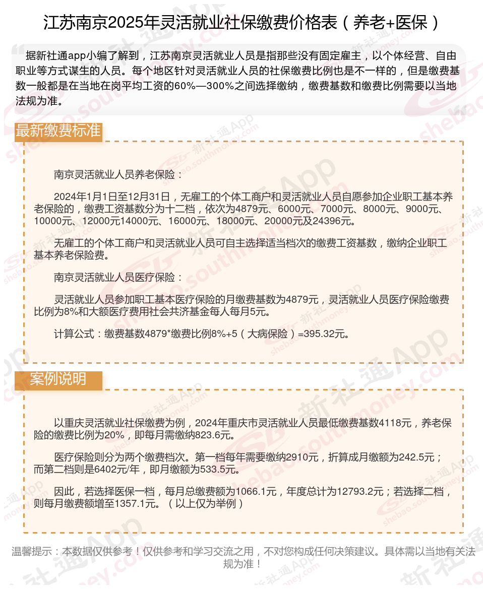 那么,江苏南京自由职业社保一个月需要交多少钱?根据新社通app-社保缴费查询工具提供的2025社保缴费标准详情数据: