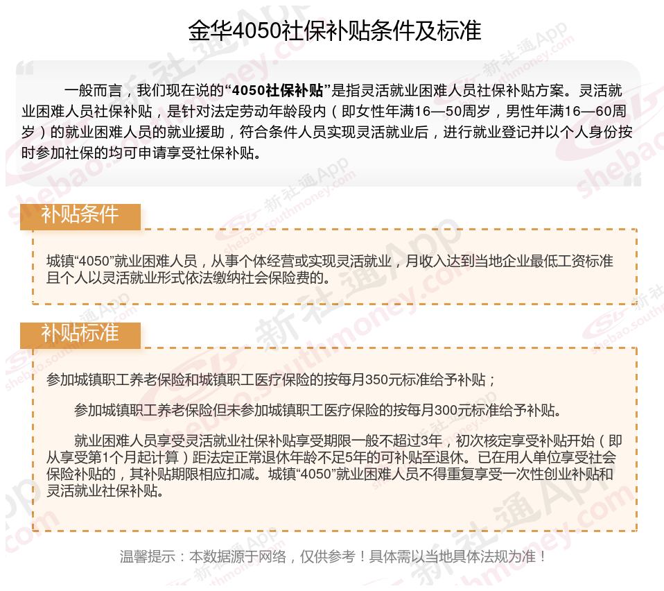 2025金华4050补贴标准是多少钱一个月?金华4050补贴到账哪里查询到账?2025金华4050补贴主要针对的是年龄在40岁以上的女性和50岁以上的男性,这些人群通常因为年龄较大而面临就业困难。