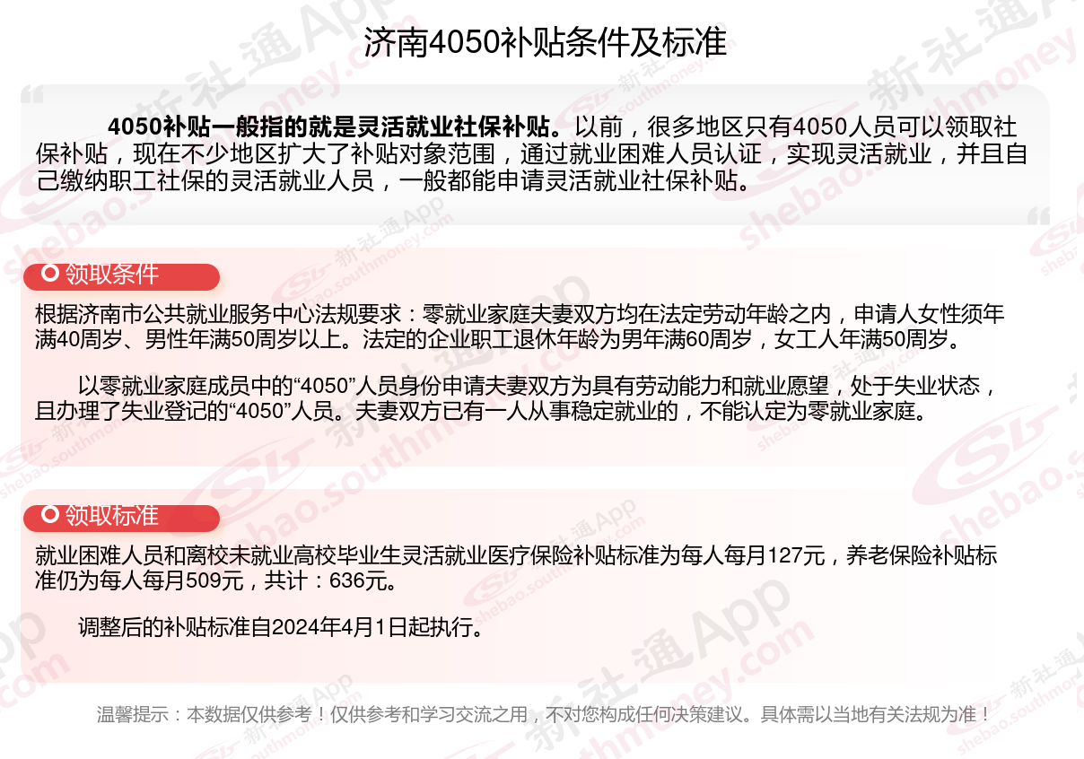 今天聊一下4050补贴话题。4050补贴听起来像是一个针对特定年龄人群的社保补贴。比如女性需年满40周岁,男性需年满50周岁(以申请当年12月31日为截止日期)。那么济南4050灵活就业社保补贴标准是多少钱?济南4050社保补贴条件是什么?接下来随新社通APP小编了解一下最新资讯。