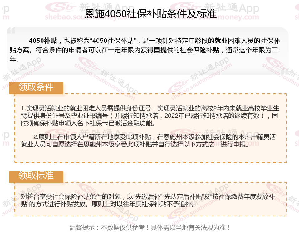 二、2025年恩施4050社保补贴标准及条件,最新如下: