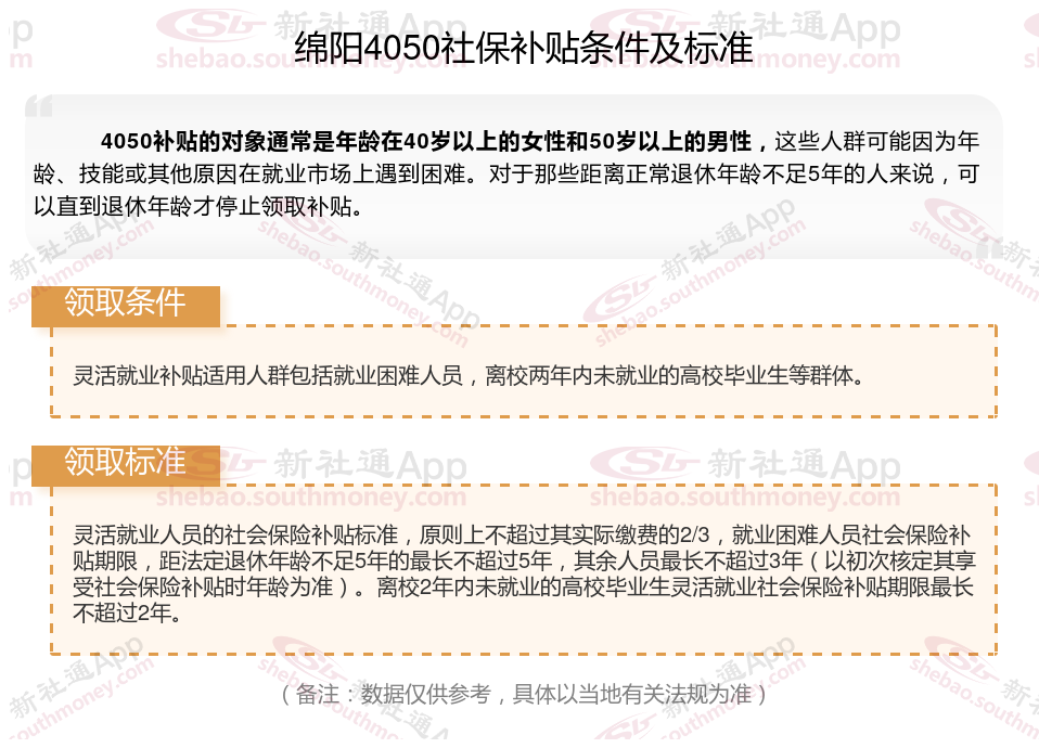 2025绵阳灵活就业4050社保补贴是一项面向特定年龄段的就业困难人群的社会保险补贴。