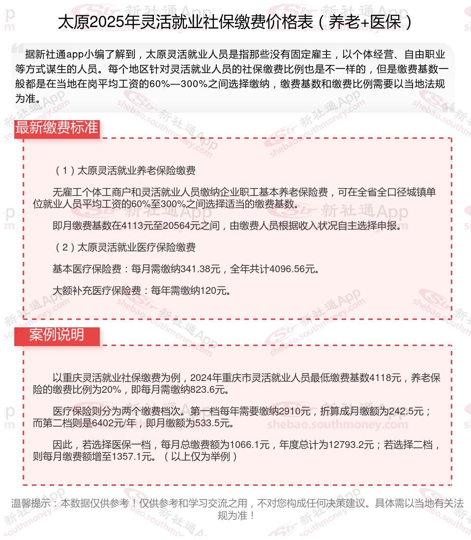 以上就是太原灵活就业社保缴费的全部内容,数据及内容供参考!希望对你有帮助,欢迎关注新社通解锁更多社保专业资讯。