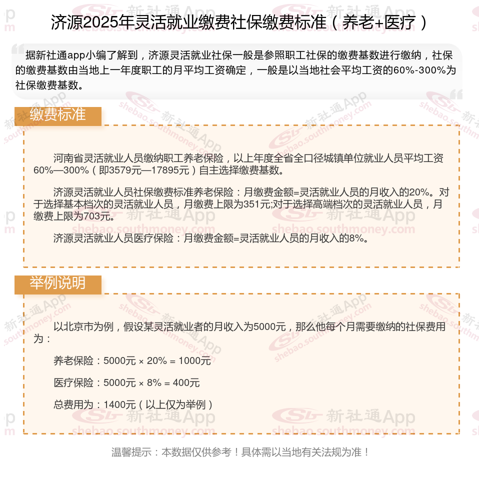 据新社通app数据显示,济源灵活就业养老保险缴费基数2024-2025年最新标准如下:
