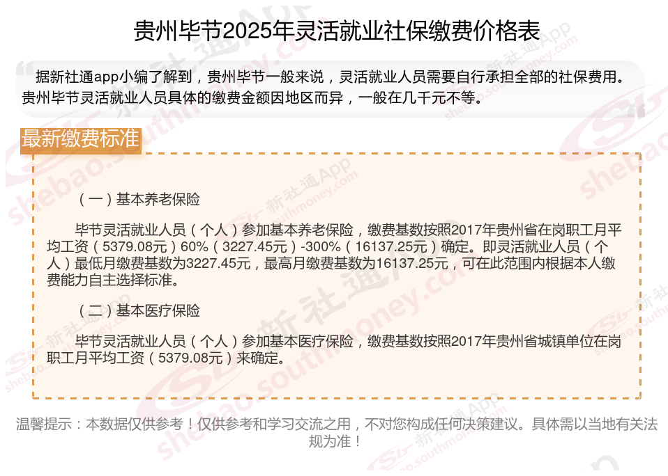 贵州毕节灵活就业人员的社保缴费标准是多少?根据新社通app-社保缴费查询工具提供的最新数据如下: