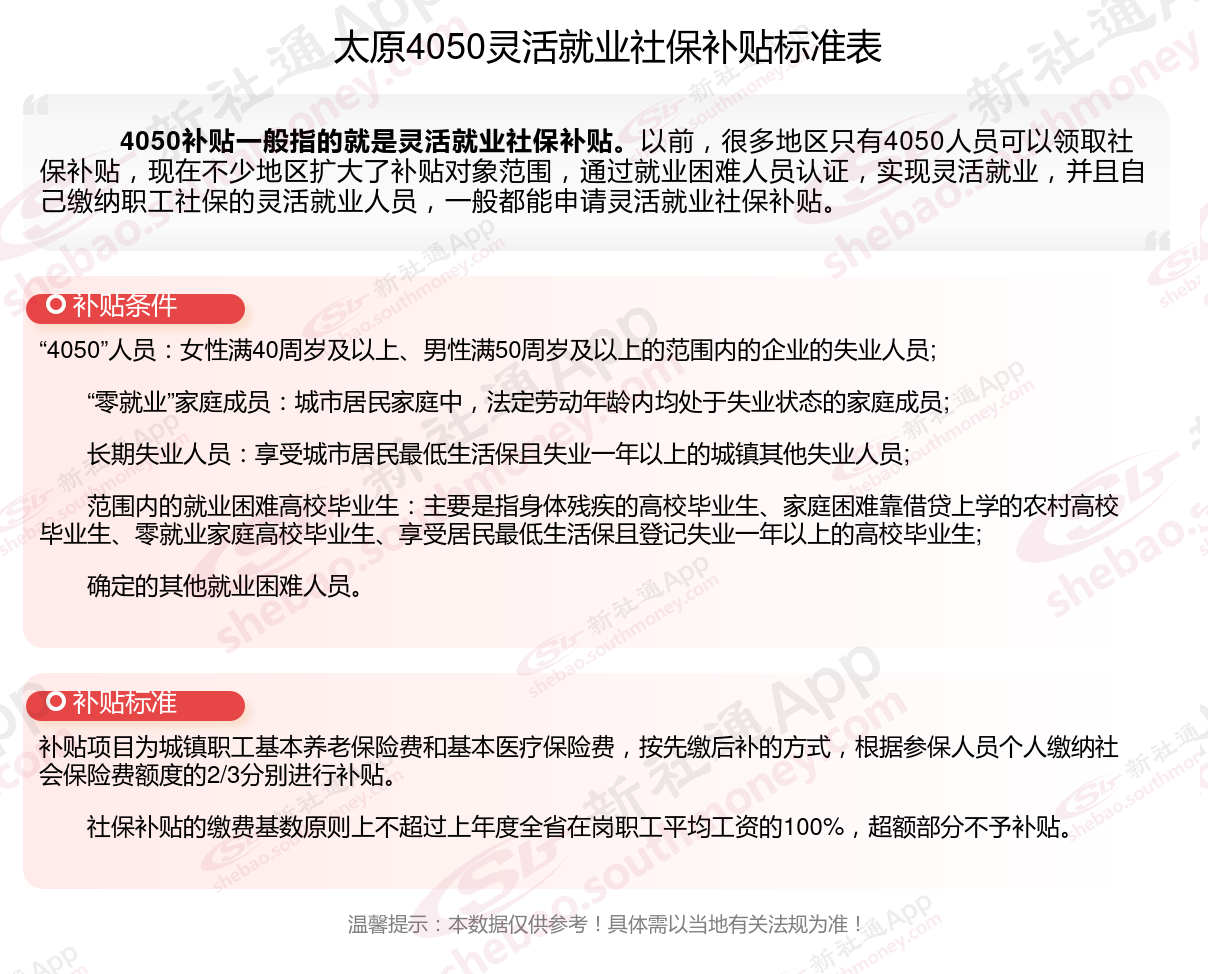 二、2025年太原4050社保补贴标准及条件