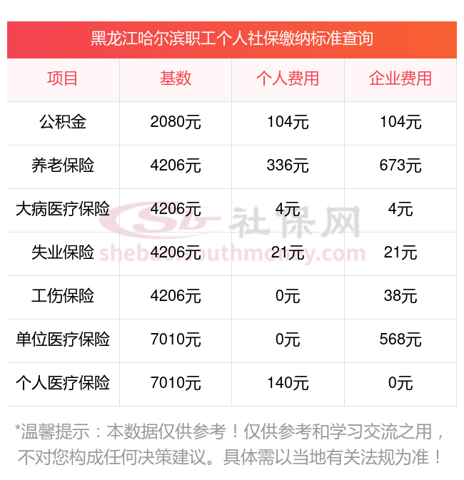 2025年黑龙江哈尔滨社保缴费多少钱?下表是2024-2025年黑龙江哈尔滨社保费用明细参考,新社通app-社保缴费查询工具提供的最新数据如下: