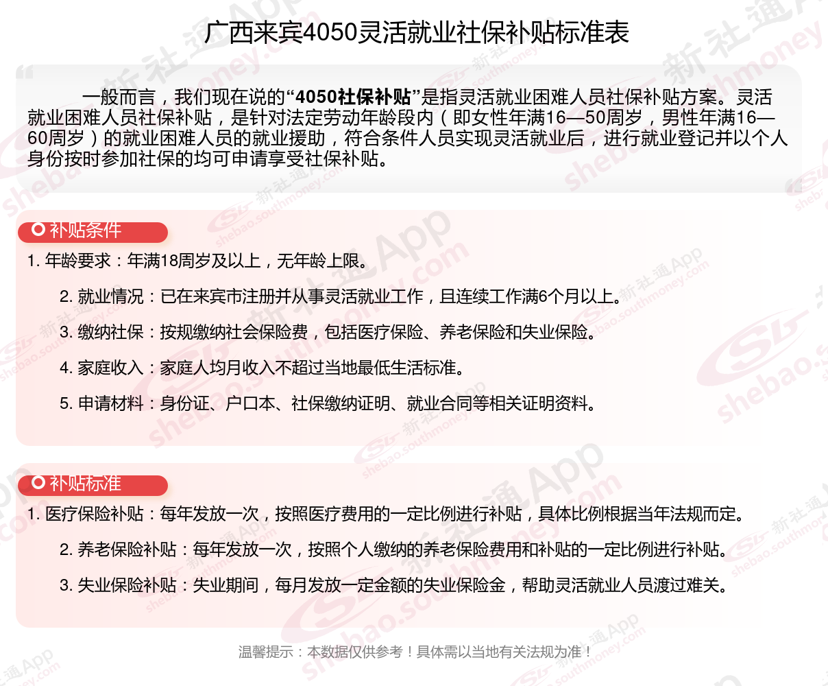 2025广西来宾灵活就业4050社保补贴是一项面向特定年龄段的就业困难人群的社会保险补贴。
