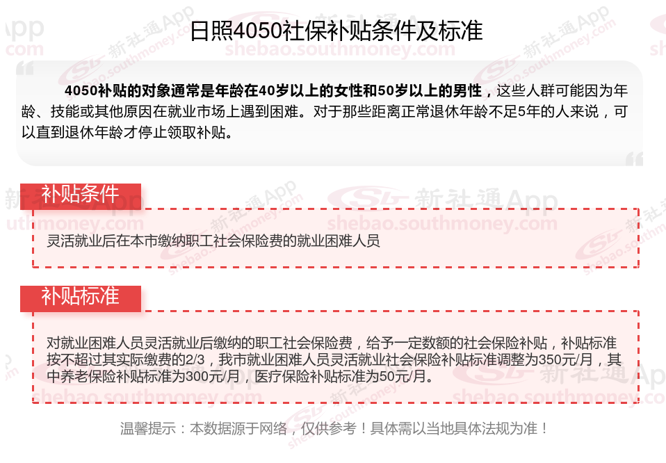 2025日照4050补贴主要针对的是年龄在40岁以上的女性和50岁以上的男性,这些人群通常因为年龄较大而面临就业困难。