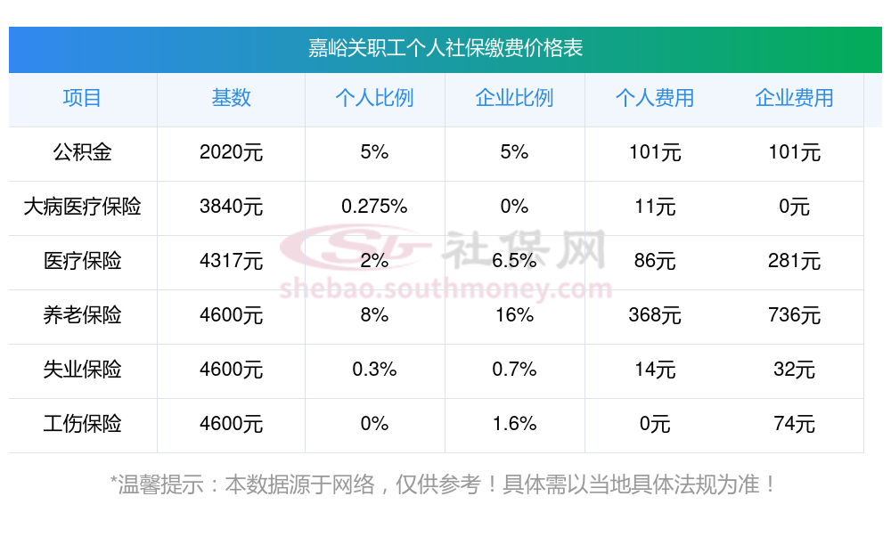 根据新社通app-社保缴费查询工具提供的最新数据,嘉峪关地区2025年的社保缴费标准已经确定。以下是各项保险的缴费比例及相应金额(基于一定的缴费基数)的详细说明: