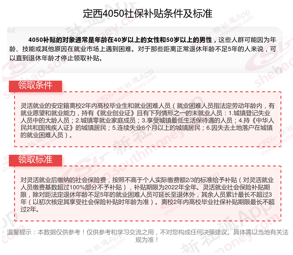 定西4050灵活就业社保补贴是什么?今天聊一下4050补贴话题。4050补贴听起来像是一个针对特定年龄人群的社保补贴。比如女性需年满40周岁,男性需年满50周岁(以申请当年12月31日为截止日期)。那么定西4050灵活就业社保补贴标准是多少钱?定西4050社保补贴可以领取多少?接下来随新社通APP小编了解一下定西4050灵活就业社保补贴的最新资讯。