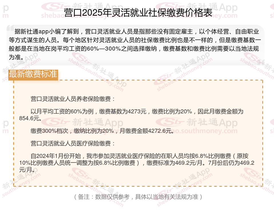 2025年营口灵活就业人员社保交多少钱,你了解2025年营口灵活就业人员社保缴费基数及比例吗,据新社通小编了解到,灵活就业社保缴费标准每年都会有所调整,主要体现在缴费基数和缴费比例上。接下来随新社通APP小编一起来看看。